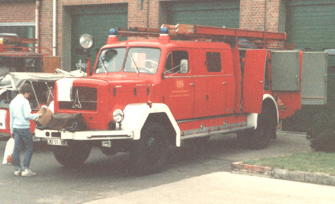 Ein LF 16 auf Magirus-Deutz der Bahnfeuerwehr des Ausbesserungswerks Hamburg-Harburg. Am 06.06.1985 war das Fahrzeug dort im Rahmen eines Tages der offenen Tür ausgestellt.